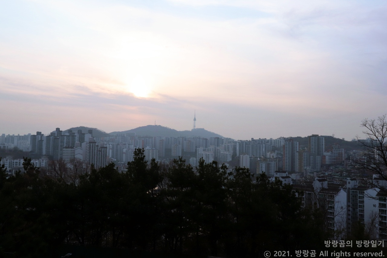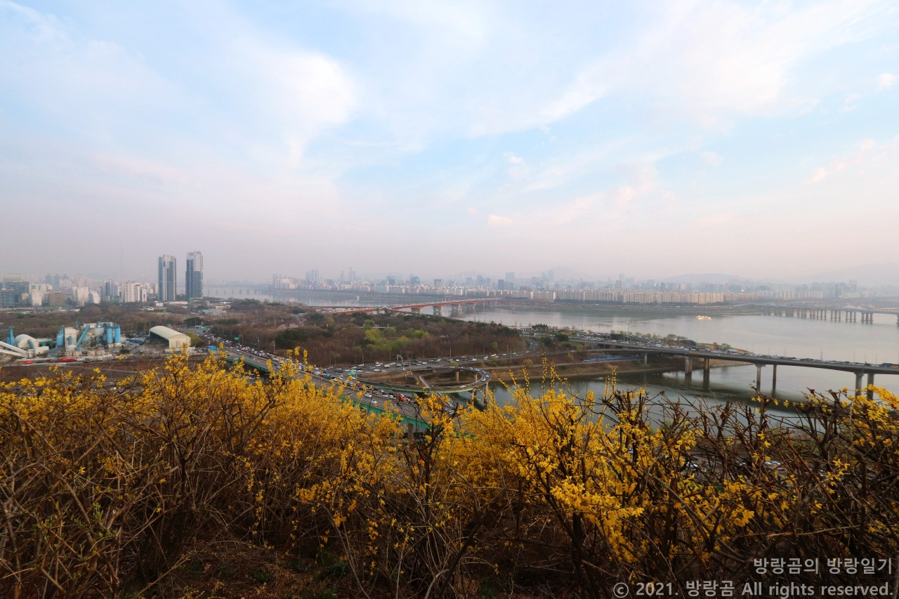 응봉산 정상까지 가는 길은 개나리가 가득하지만, 정상에는 오히려 개나리가 거의 없다. 그래서 정상에서 바라보는 한강과 서울의 모습을 바라보는 데 더 집중할 수 있었다. 한강이 굽이쳐 흐르고 그 위에 차들로 가득한 성수대교와 강변북로의 모습을 한참동안 바라봤다. 그리고 뒤를 돌아보면 멀리 남산이 보이고 그 아래에는 아파트와 고층 건물들이 빼곡하게 들어차 있다. 그렇게 응봉산 정상에서 한참동안 서울의 모습을 바라보다가 내려왔다.