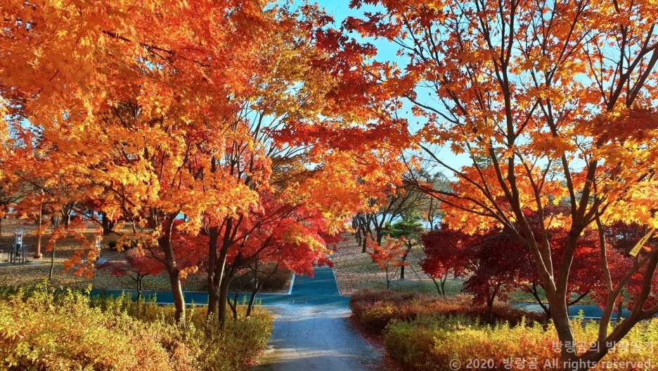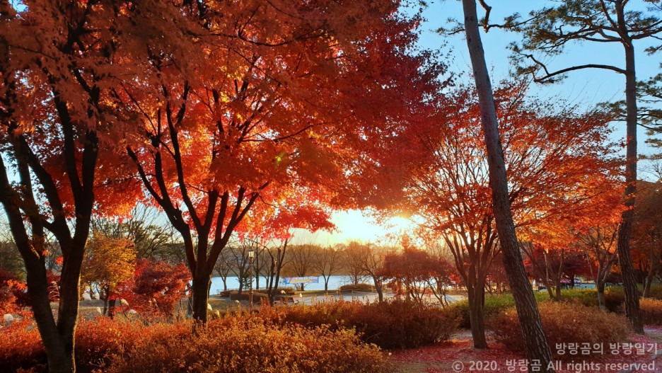 단풍나무를 보면서 꿩 대신 닭이라는 속담이 생각났다. 꿩 대신 닭이라도 보자는 심정으로 신륵사로 왔는데, 오히려 꿩보다 더 좋은 닭이 눈에 들어온 것이다. 강천섬에서 노란 은행나무 단풍을 못 봐서 아쉬웠던 마음을 신륵사에서 보상받고도 남은 기분이었다. 그만큼 충분히 아름다웠고, 만족스러웠던 단풍나무였다. 물론 수많은 단풍이 모여있는 것이 아니라 작은 공원에 있는 몇 그루의 단풍나무긴 했지만, 새빨갛게 물들어 있는 단풍나무의 모습은 나무의 숫자와 관계없이 충분히 강렬했다.