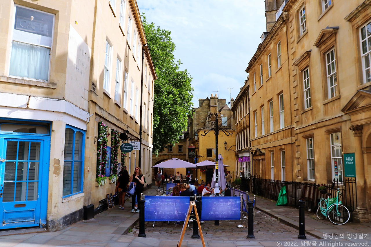 로만 바스에 들어갈 생각이 없던 우리는 박물관 입구 바로 옆에 있는 웅장한 건물로 다가갔다. 이 건물은 바스 수도원(Bath Abbey)으로, 역시 많은 여행객들이 로만 바스와 함께 들르는 곳이다. 우리는 수도원의 분위기를 볼 겸 내부로 들어섰다. 하지만 영국의 다른 수도원이나 교회가 비슷한 분위기이기도 했고, 날씨가 워낙 좋아서 실내에서 시간을 보내고 싶지 않아서 수도원에서 빠르게 나왔다. 그렇게 우리는 바스의 또 다른 명소인 펄트니 다리(Pulteney Bridge)를 향해 걷기 시작했다. 다만, 다리에 무조건 빨리 도착해야겠다는 생각이 아니라, 그저 바스의 골목길을 둘러보면서 가다보면 언젠가 도착하겠지라는 생각으로 길을 거닐었다. 자연스럽게 우리의 발걸음은 느렸고, 중간에 멈추는 일도 많았고, 흥미로운 곳이 있으면 안으로 들어가 보기도 했다. 우리의 목적은 바스를 자세히 둘러보면서 바스의 깊은 모습을 보는 것이었지, 바스를 '관광'하는 것이 아니었다.