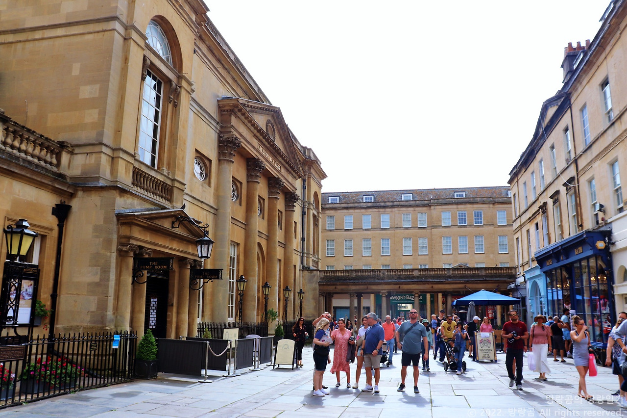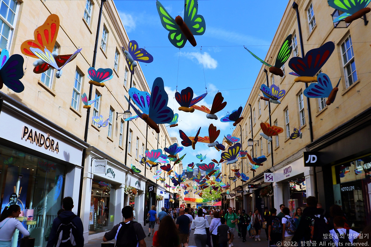 바스 기차역에 내려서 시내로 향하는 길목에 들어서자마자 수많은 사람들로 뒤덮인 거리가 나왔다. 도심으로 향하는 길 위에는 나비 모양의 장식들이 매달려 있어서 거리의 분위기가 더 활기차고 산뜻한 느낌이었다. 오랜만에 다시 찾은 바스였는데, 우리가 예전에 느꼈던 바스의 좋은 분위기가 그대로 전해졌다. 우리는 그 분위기에 취해 무작정 길을 따라 걸었다. 사람들만 따라가면 바스의 중심거리에 도착하기 때문에 지도를 굳이 보지 않아도 길을 잃을 염려가 없었다. 덕분에 우리는 바스의 거리 모습을 눈에 담아가면서 발걸음을 옮겼다. 얼마 후에 사람들이 많이 모여있는 곳에 도착했고, 우리는 그곳이 고대 로마 시대 목욕탕이었던 로만 바스(Roman Bath)라는 사실을 멀리서부터 알았다. 이곳은 과거 로마 시대의 목욕 문화를 볼 수 있는 박물관이기 때문에, 바스를 여행하는 사람들이 대부분 들렀다 가는 곳이다.