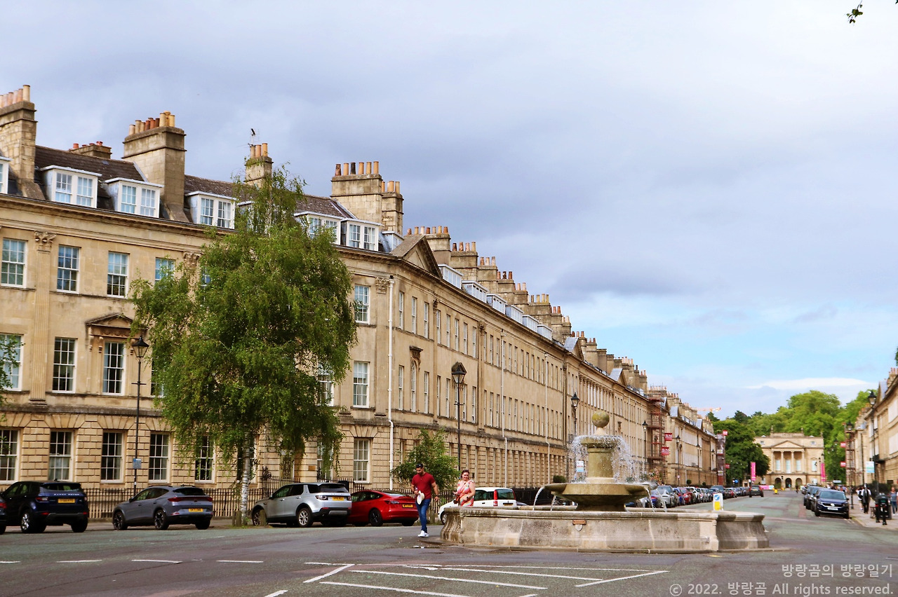 펄트니 다리를 건너면 에이본 강가로 내려가는 계단이 바로 나온다. 그리고 대부분의 여행객은 이 계단을 따라 내려간다. 나도 바스에 올 때마다 펄트니 다리를 건넜고, 그 때마다 다른 여행객과 마찬가지로 이 계단을 타고 강가로 내려갔다. 하지만, 이번에 우리는 길을 따라 조금 더 걸어갔다. 그 너머에 건물이 길게 이어지는 모습이 멋있어 보이기도 했고, 그냥 그곳의 풍경이 궁금했기 때문이다. 이전에는 바스 강가만 바라보고 그곳만을 향해 여행했다면, 지금은 바스도 꽤 여러번 와서인지 목적지를 정하더라도 주변을 둘러보면서 여행하는 여유가 생긴 것이다. 아본강 반대편에는 사람이 별로 없어서 조용했고, 노란색 계열의 건물이 조화롭게 지어져 있었다. 그리고 다리 건너서 바로 나오는 교차로에는 작은 분수가 하나 있었는데, 분수 뒤로 일자로 이어지는 길과 건물이 인상적이었다.