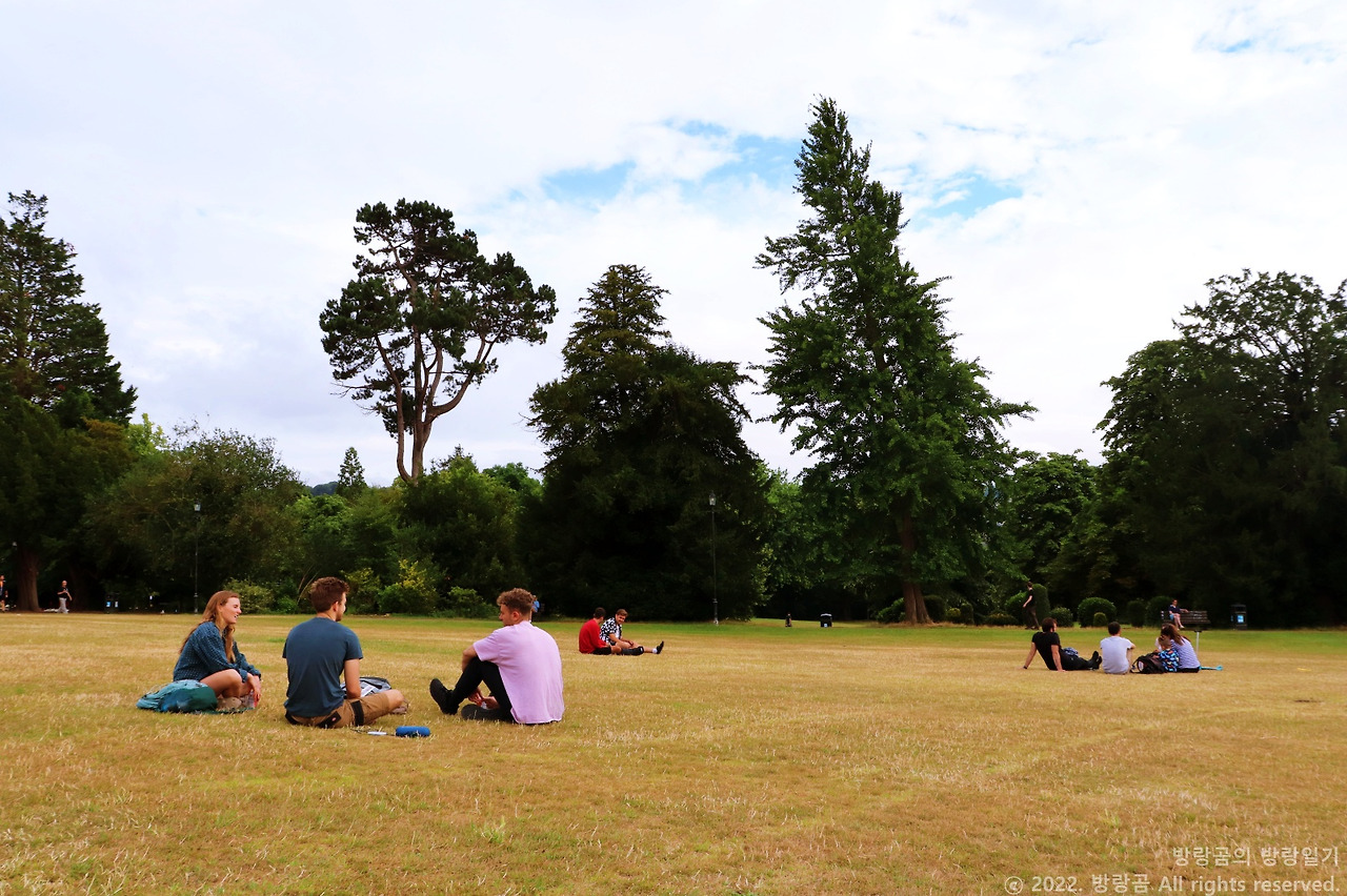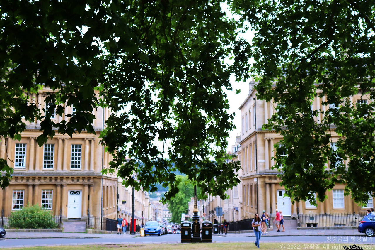 우리는 가던 길을 이어갔다. 로만 바스를 다시 지났고, 이제는 많이 한가해진 중심가를 걸었다. 그곳을 지나서 조금 더 가니까 사람들이 많이 모여있는 공간이 나왔다. 식당과 펍 등이 모여있는 장소였는데 오후에 상점이 모여있는 거리에 있던 사람들이 저녁 때가 되니까 이곳으로 다 모여온 것 같았다. 유명한 식당은 이미 사람들로 가득 차 있었고, 펍에서 맥주를 즐기는 사람들도 많았다. 우리도 저녁을 먹고 움직일까 하다가 목적지까지 갔다가 돌아오는 길에 식당에 가기로 했다. 아직은 배가 많이 고프지 않았고 어두워지기 전에 바스를 조금 더 보고 싶었기 때문이다. 그래서 식당의 유혹을 뿌리치고 길을 계속 걸었다. 언덕을 조금 오르면 회전교차로 형태의 커다란 원형 도로가 나온다. 도로 안에 있는 섬에는 커다란 나무가 심어져 있는데, 이곳에 우리의 추억이 깃들어 있다. 나와 짝꿍이 연애를 시작한 지 얼마 되지 않았던 날, 바스로 함께 놀라왔던 우리는 이 나무들 아래서 사진도 찍고 이런저런 이야기를 많이 나누면서 서로에 대해 조금은 더 알아갔던 곳이다. 그 추억이 깃든 장소에 오랜만에 찾아오니까 묘한 감정이 들었다. 그리고 우리는 같은 장소에서 원래 있던 추억 위에 또 다른 추억 하나를 쌓았다.