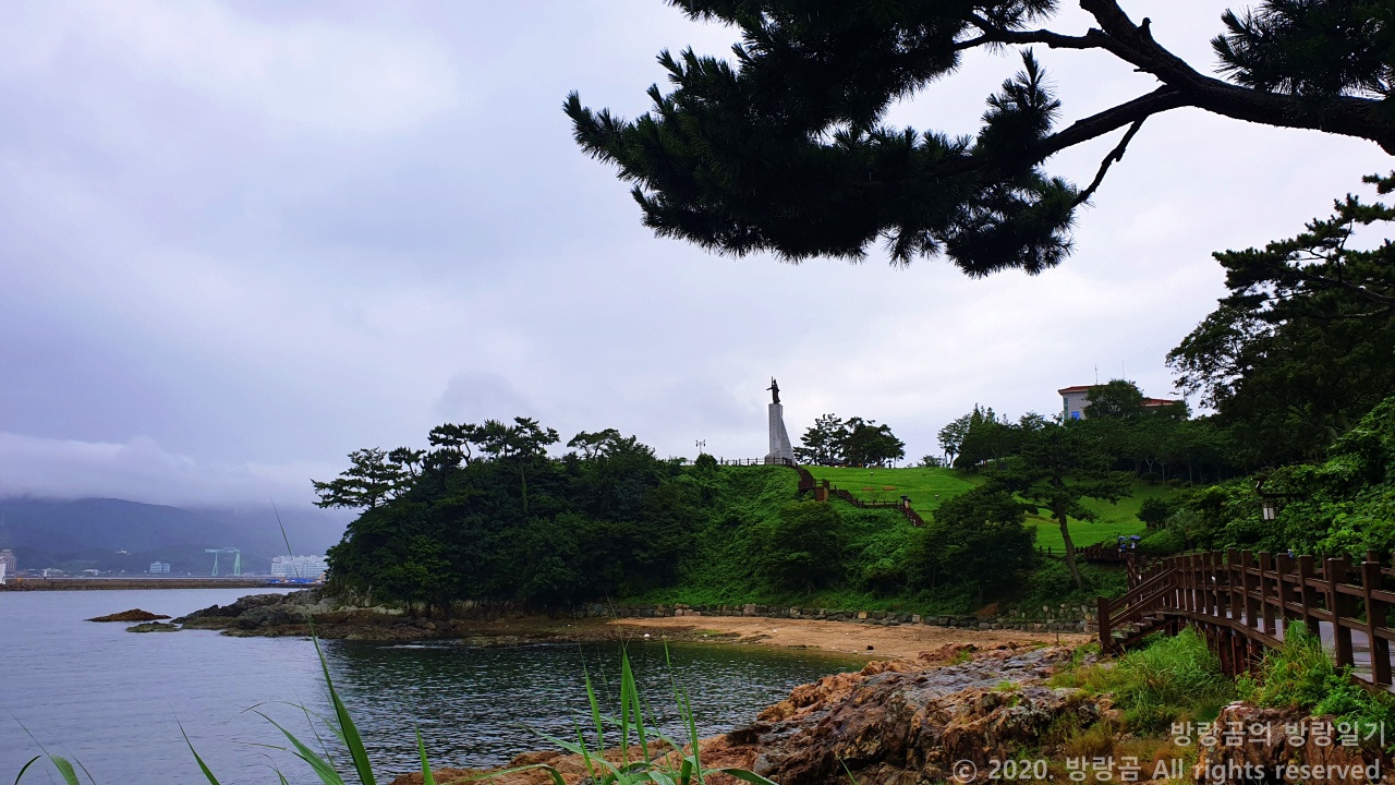 우리가 이순신공원에 찾아갔던 날은 비가 오락가락하는 날이었다. 그 전에 미륵산에서 비에 홀딱 젖은 경험이 있어서인지, 이번에는 출발할 때 비가 오지 않았는데도 우산을 챙겨서 갔다. 그리고 이순신장군 동상 앞에서 사진을 찍고 벤치에 앉아서 물을 마시고 있으려니까 비가 내리기 시작했다. 우리는 우산을 펼쳐 들고 벤치에 가만히 앉아 있었다. 나와 짝꿍 모두 비 내리는 소리를 좋아하는데, 비가 우산에 부딪히는 소리가 꽤 듣기 좋았다. 그리고 벤치에 앉아서 텅 비어 버린 공원과 바다를 멍하니 바라보고 있었다.
