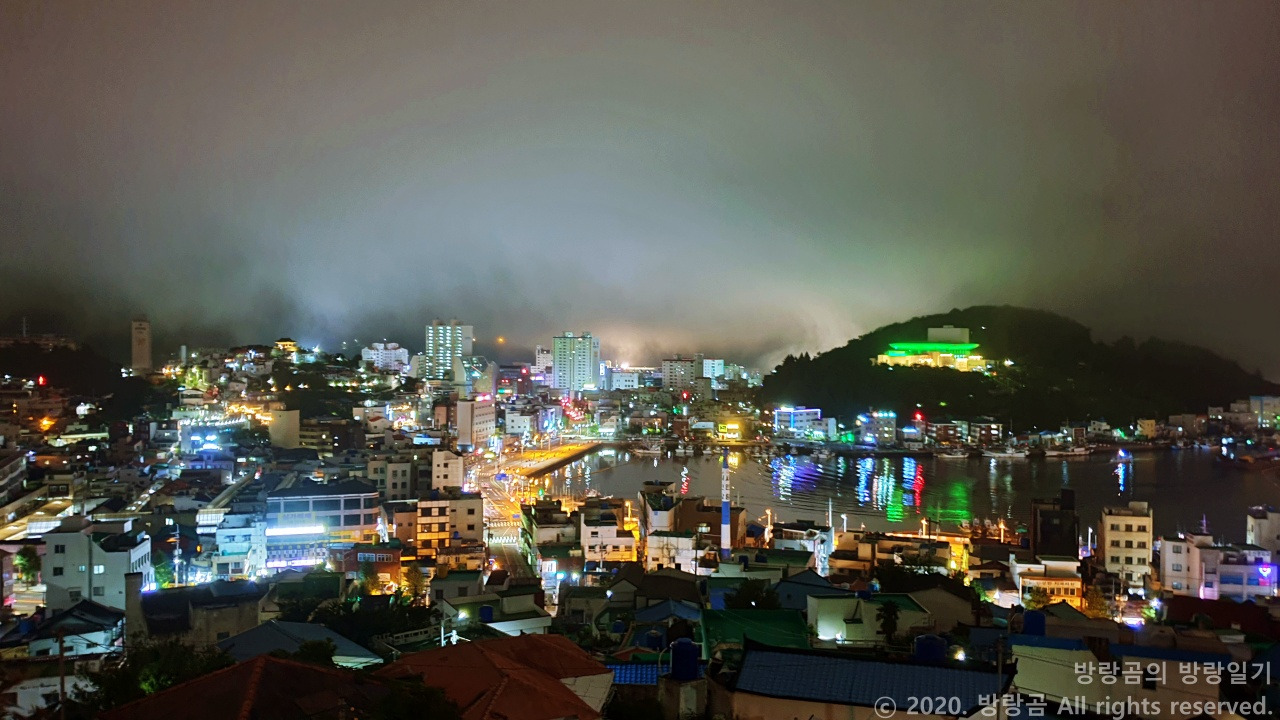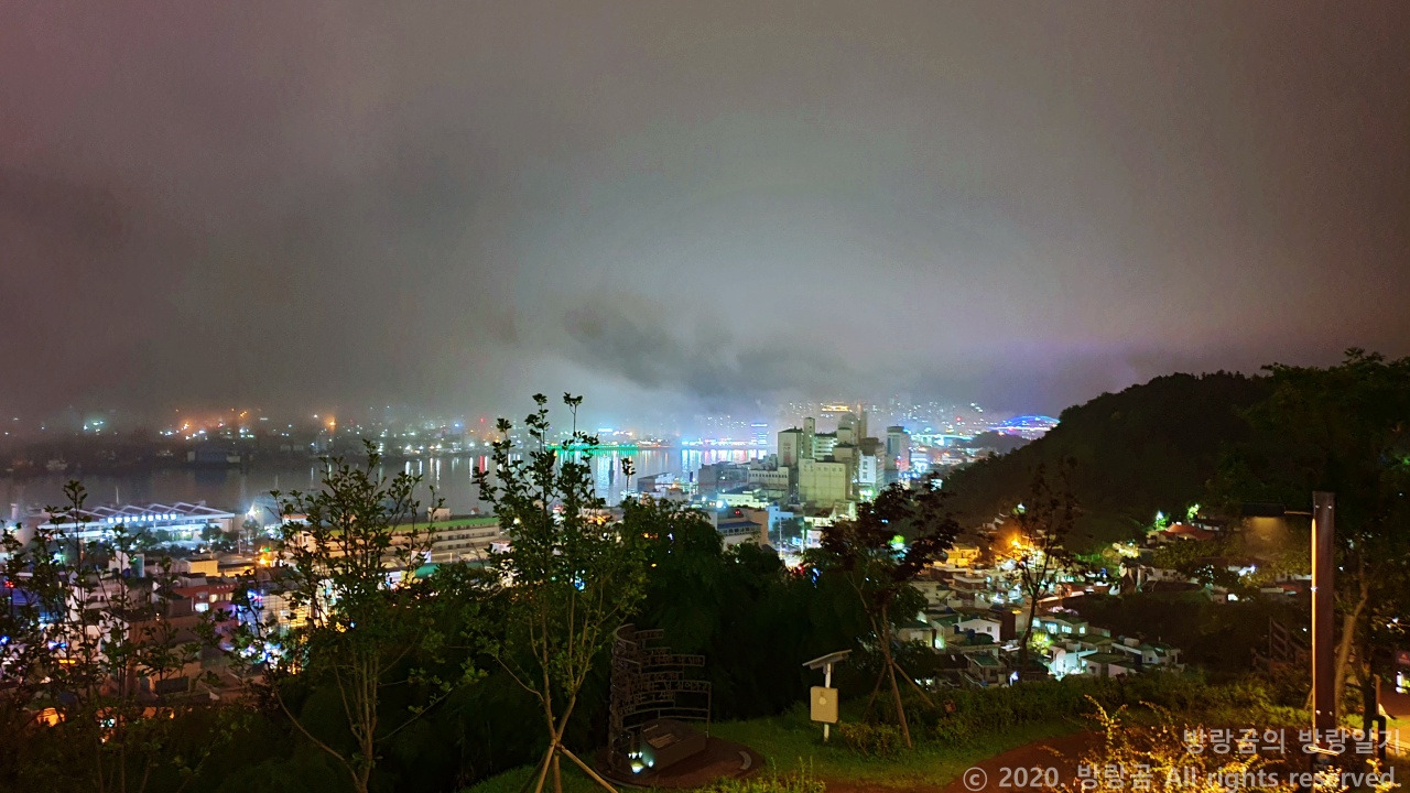 우리가 서피랑공원에 올라간 시간은 밤 9시 즈음이었다. 늦은 시간과 더불어 비가 오락가락하는 날씨 탓에 공원 안에는 사람이 한 명도 없었다. 워낙 사람이 없다 보니까 길을 따라 올라가면서도 이 길이 맞는지 의심마저 들었다. 사람이 있으면 그 사람들을 보면서 따라가면 되는데, 텅텅 비어버린 공원에서는 우리 스스로 길을 찾아야만 했다. 그렇게 스스로에게 질문을 던지면서 열심히 걸어 올라간 끝에 통영 시내가 내려다보이는 지점에 다다를 수 있었다.